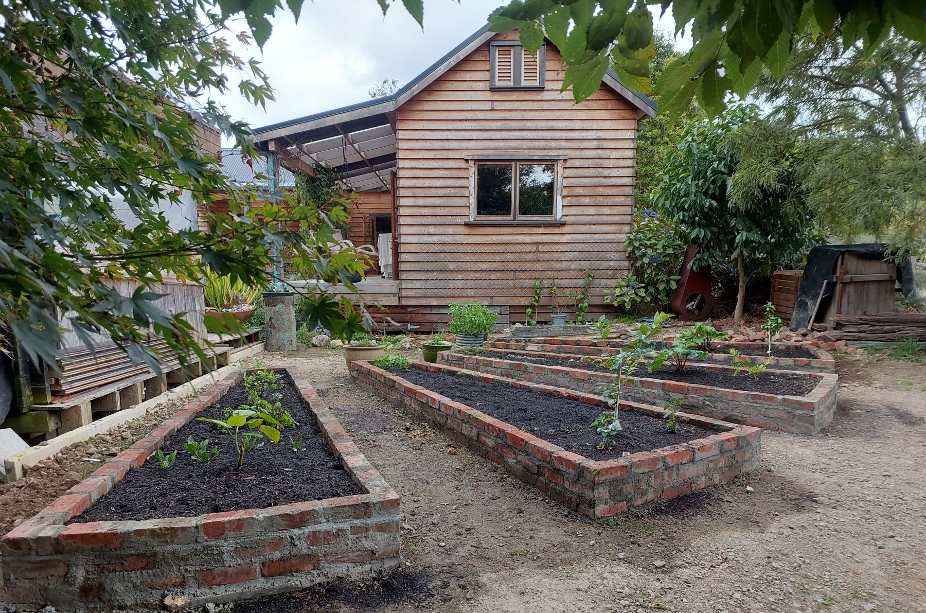 I have been fascinated by the paradise gardens of Persia, Morocco and other far-flung places, for ever – I love the concept of living outside but within a protected, enclosed area. In rural New Zealand though the fully enclosed garden seems a little unnecessary. I have seen shearers quarters which have a similar feel – and it is this that inspired my house and garden. It is based on the typical “shearers quarters” layout with separate buildings for separate uses linked with verandahs and a central outdoor living space. I designed and sketched up this house and garden before I even bought the property and it has not changed much in the translation although Simone Van der Plas of Encompass Designs made some important changes in the detail design phase.